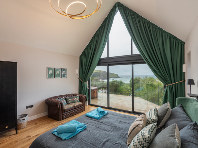 Bedroom 1: With super kingsize bed, sliding doors leading to decking, vaulted ceiling and en-suite wet room and toilet.