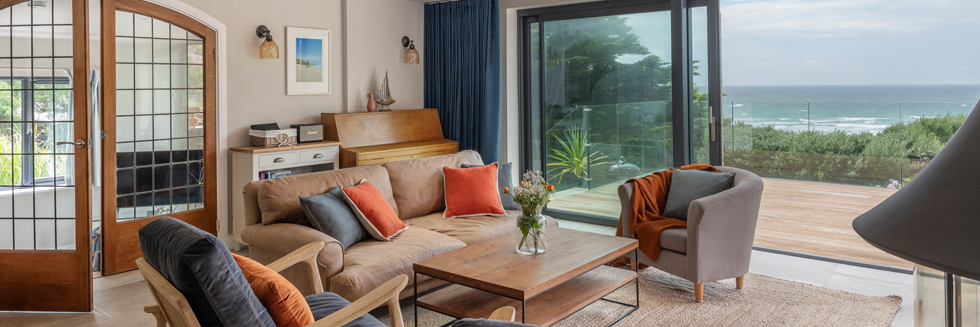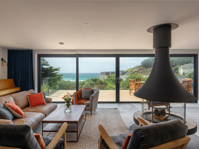 Living area: With circular fireplace, piano, bluetooth speaker and floor to ceiling sliding doors to decking.