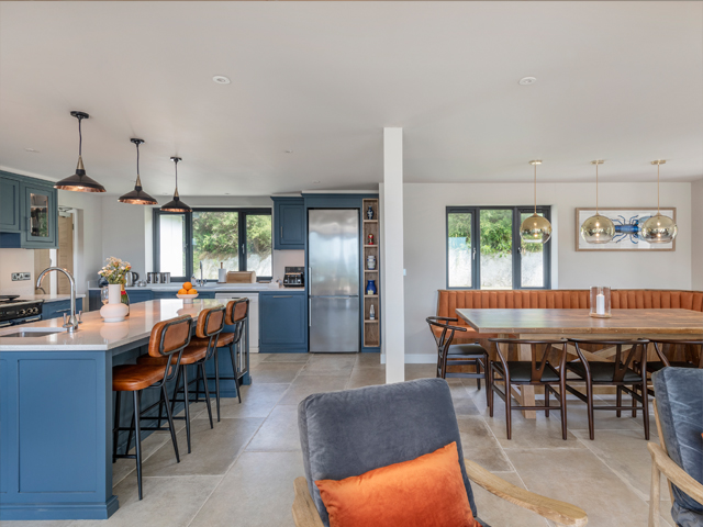 Kitchen area: With gas 5-ring double oven range cooker, microwave, fridge/freezer, wine fridge, dishwasher, Nespresso coffee machine and larder.