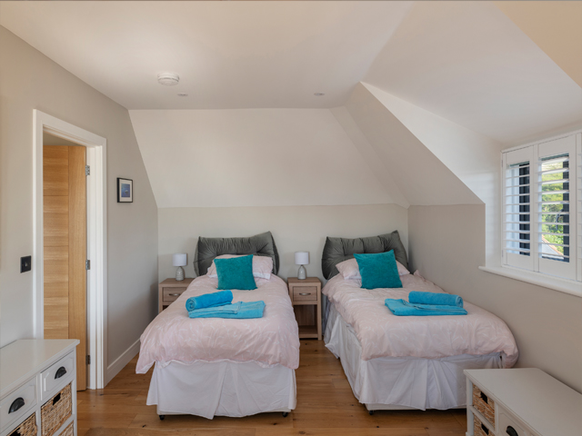 Bedroom 6: With zip and link twin bed (can be super kingsize on request) and folding single bed (for flexible sleeping arrangements) and en-suite with shower and toilet.